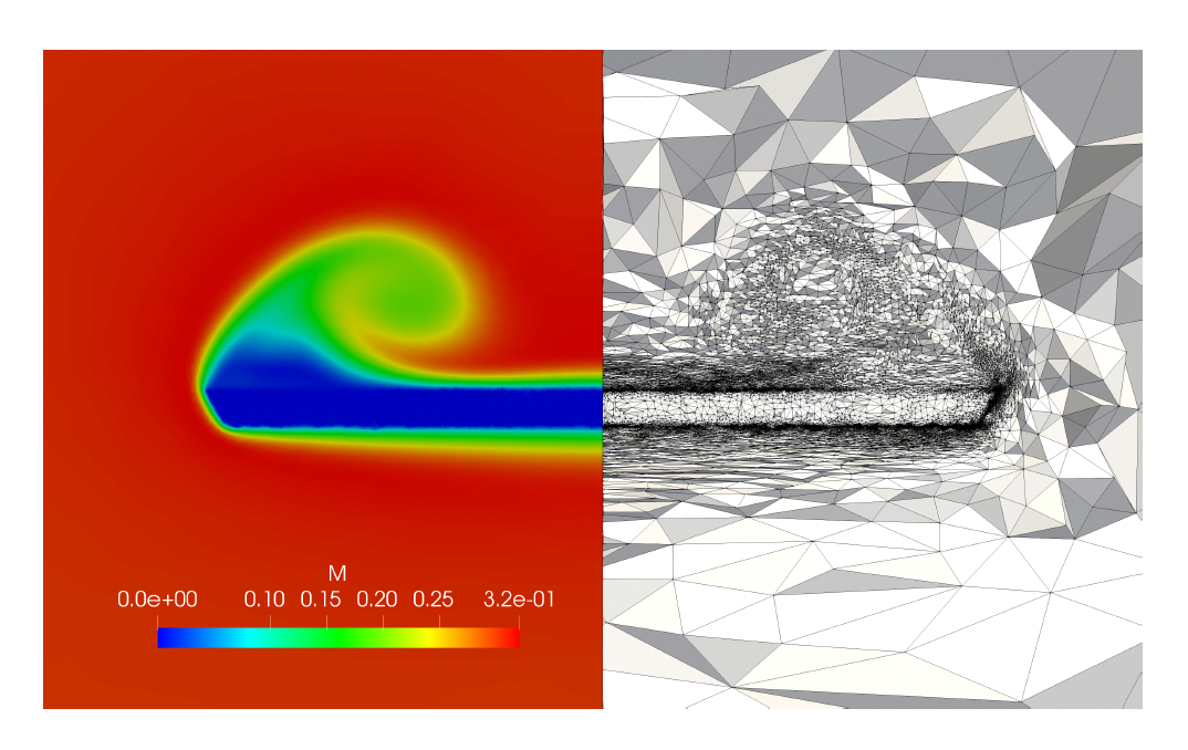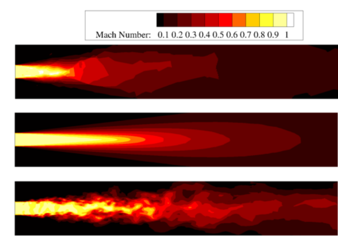 Mach field on initial (top) and final adapted mesh (middle) using RANS equations. Instantaneous Mach number on final adapted mesh using hybrid RANS/LES equations (bottom).¶
